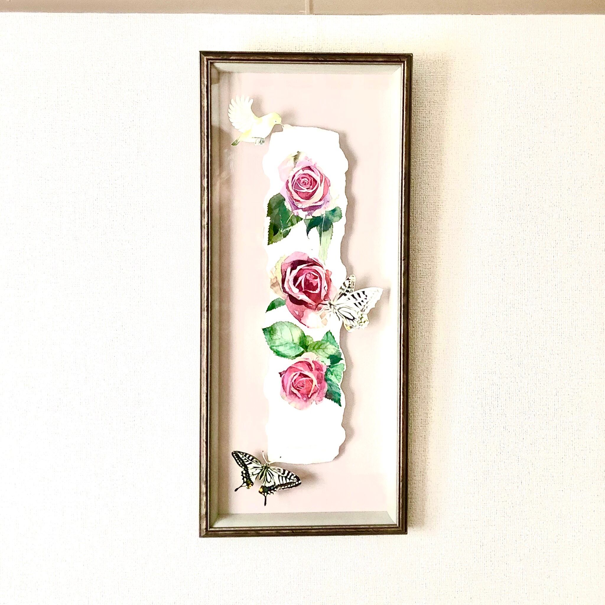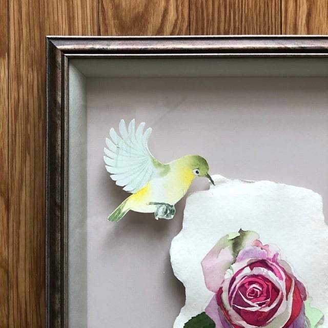 蝶を2点とメジロを1点描き、立体的に配置しました。