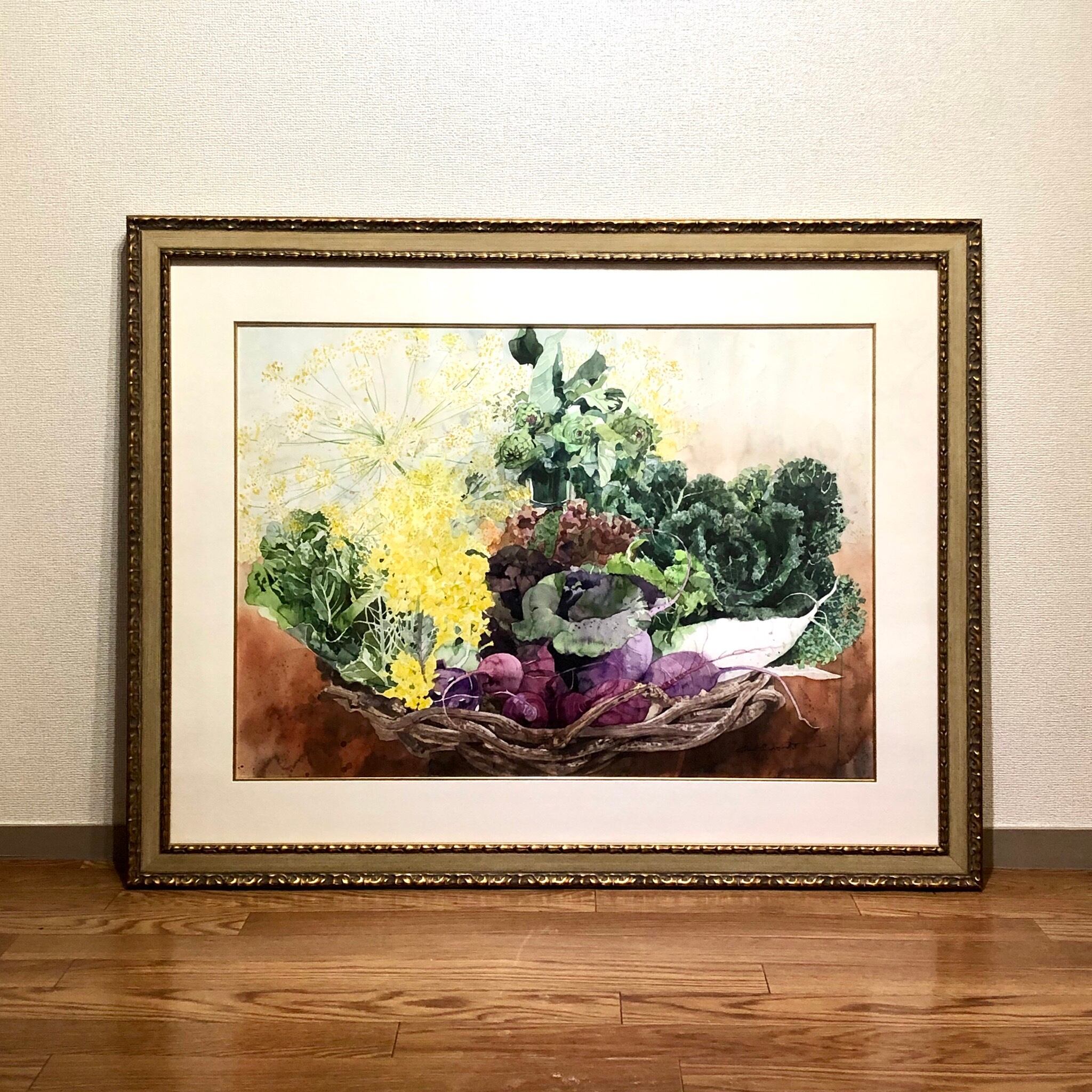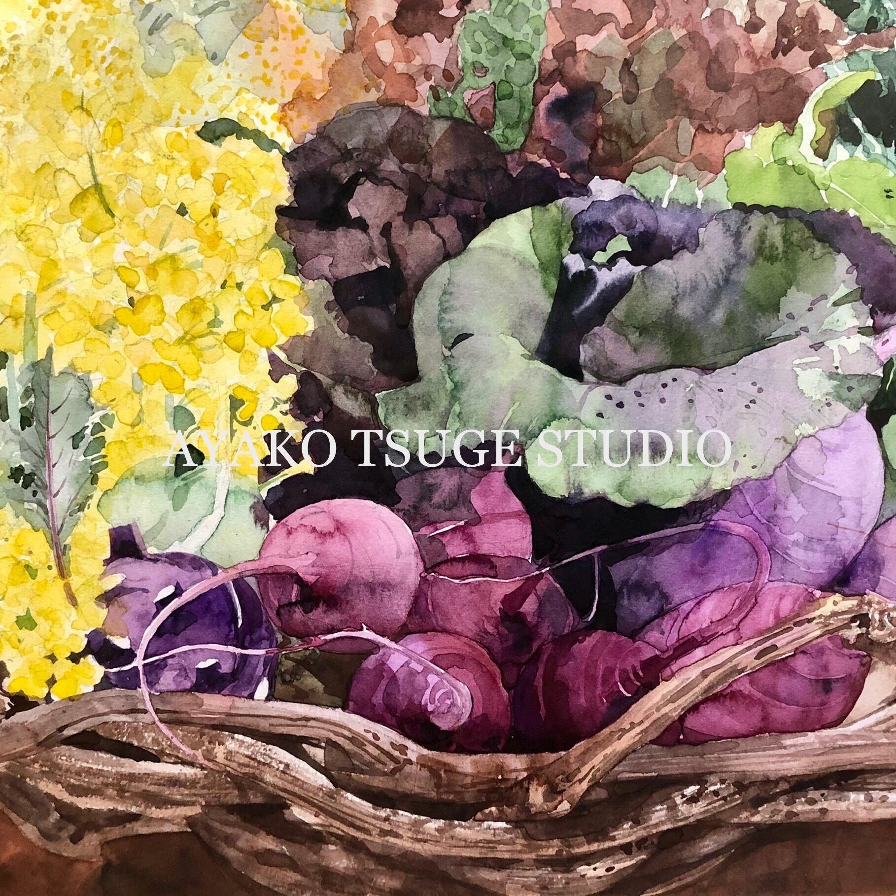 野菜の花が美しいので、それを描きたいと思い、野菜の花をたくさん籠に入れて描きました。