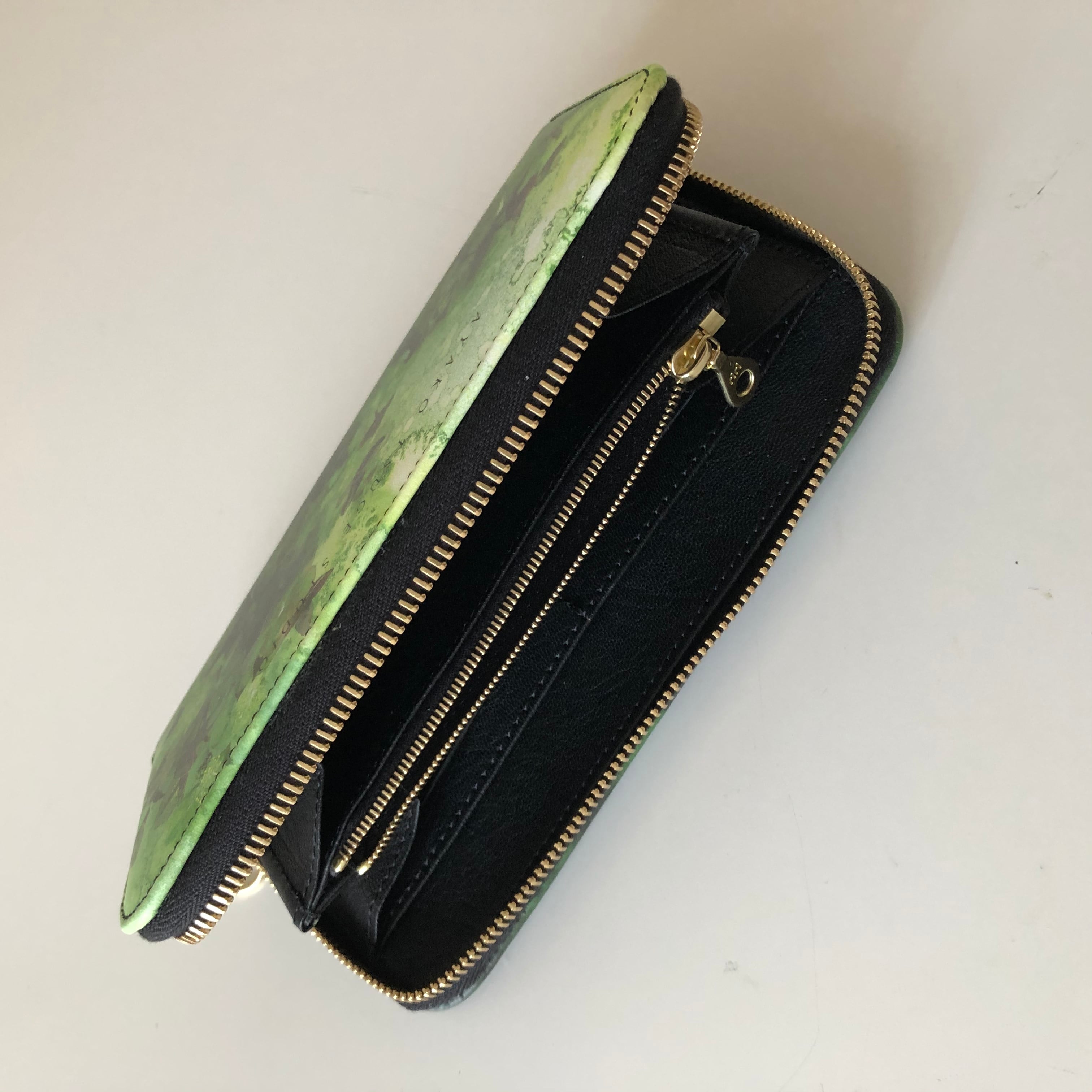 Description: A leather pouch made from 100% Italian leather. A durable zip on the classic shaped pouch protects your precious accessories. It has a card compartment and a zippered pocket inside, so you can use it as a wallet. This stylish, authentic leather pouch has a capacity and has a gorgeous watercolor work's pattern.