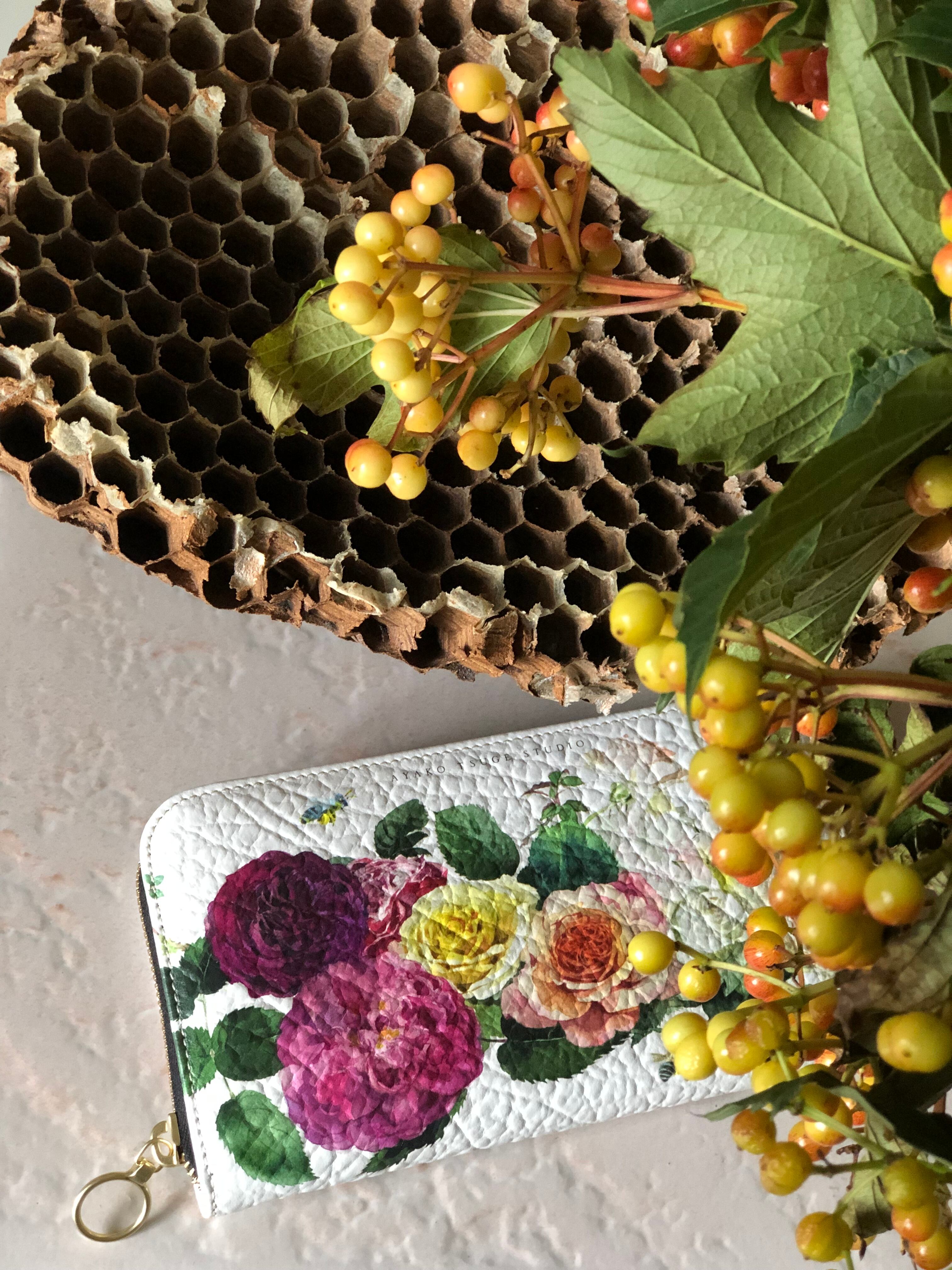 2020年制作「和薔薇とブルービー」水彩画をレザーにプリントして財布を制作致します。
