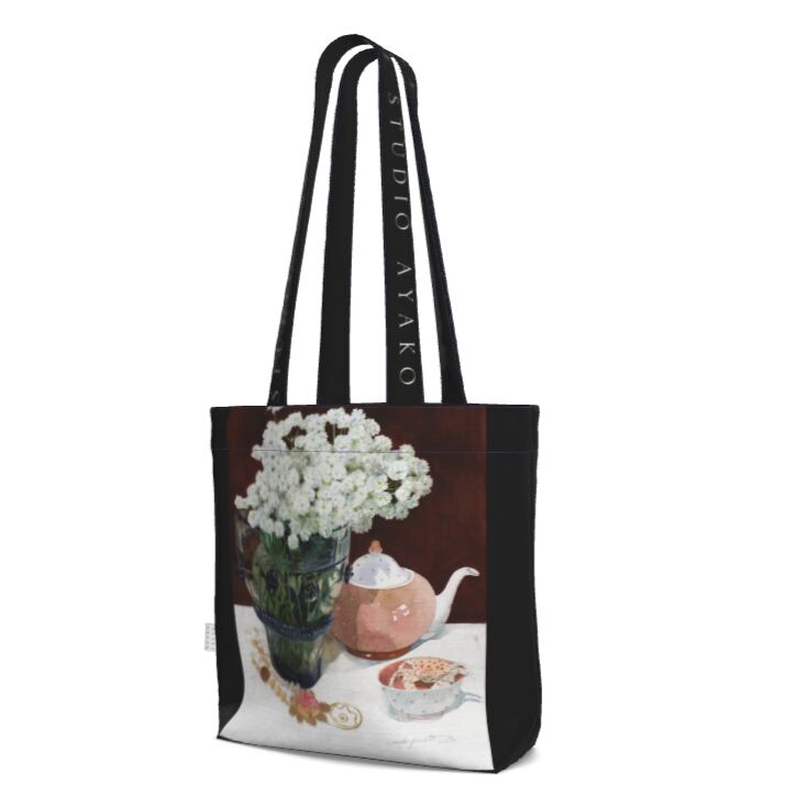 絵柄としては、ハンドル部分に「AYAKO TSUGE STUDIO」のロゴに、3種類のドングリの水彩画を配置しました。ハンドルと底面が黒なので、汚れを気にすることなくデイリーに使えます。