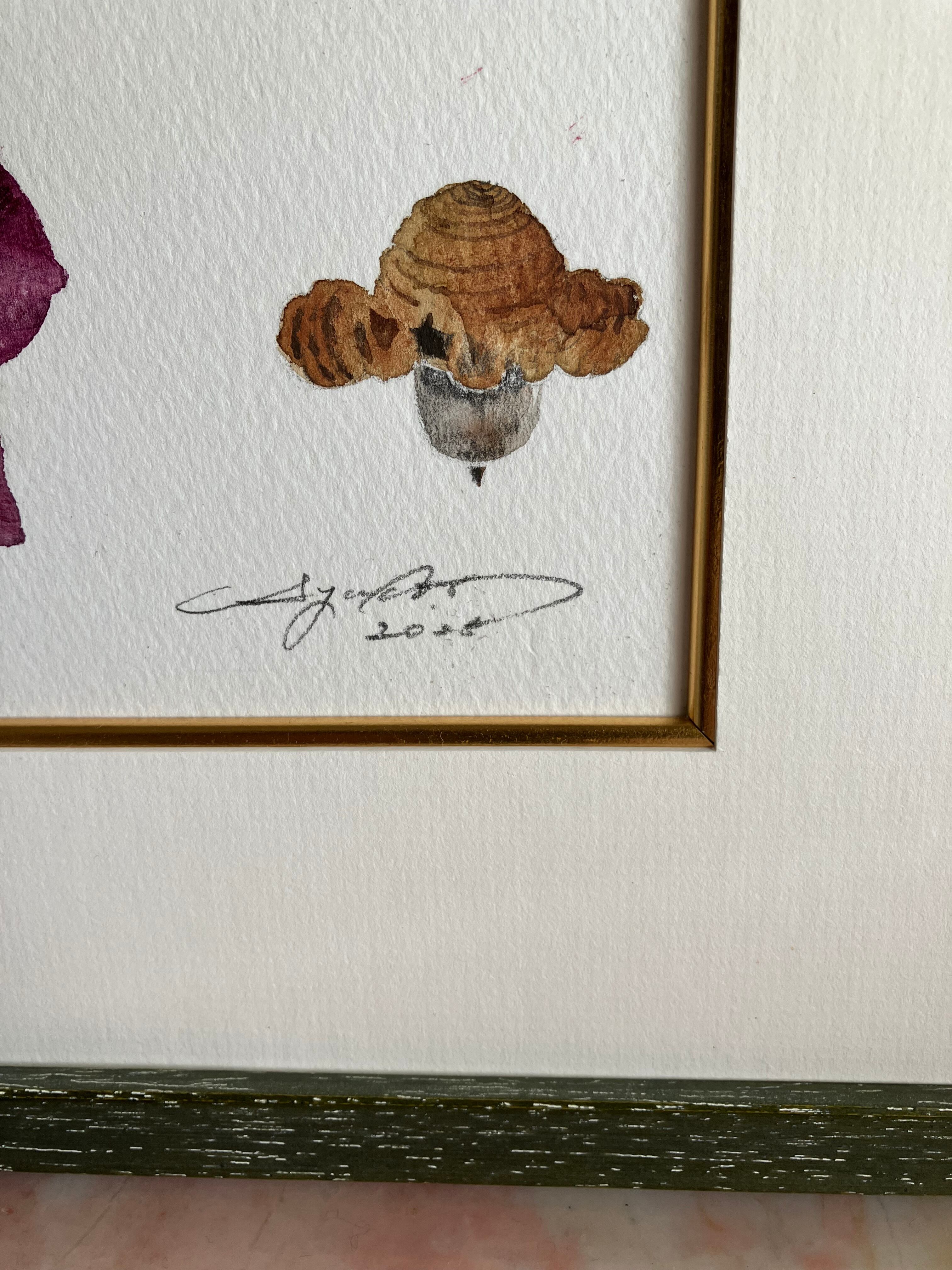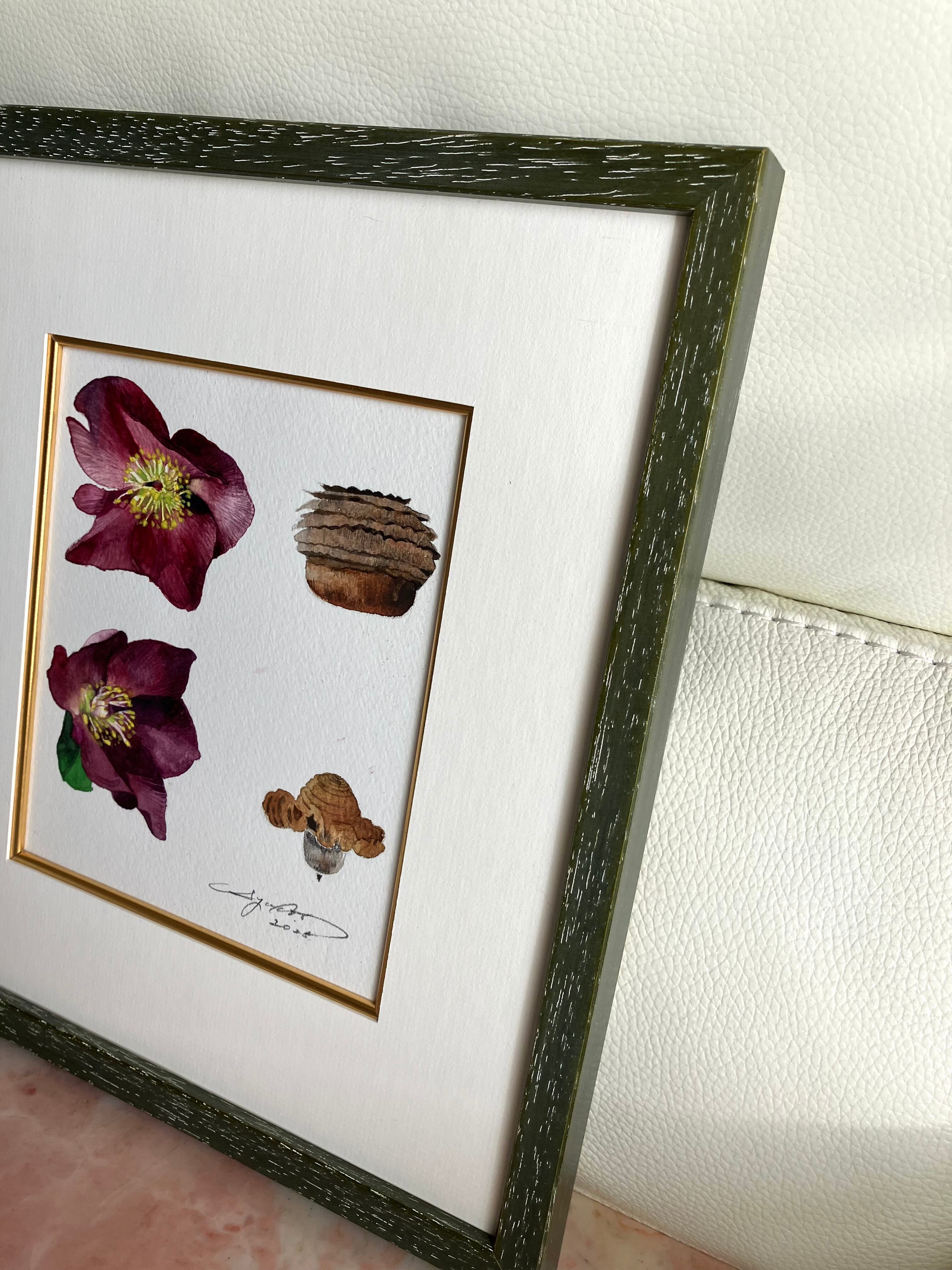 クリスマスローズとどんぐりの水彩画です。 額装状態でお届けします。